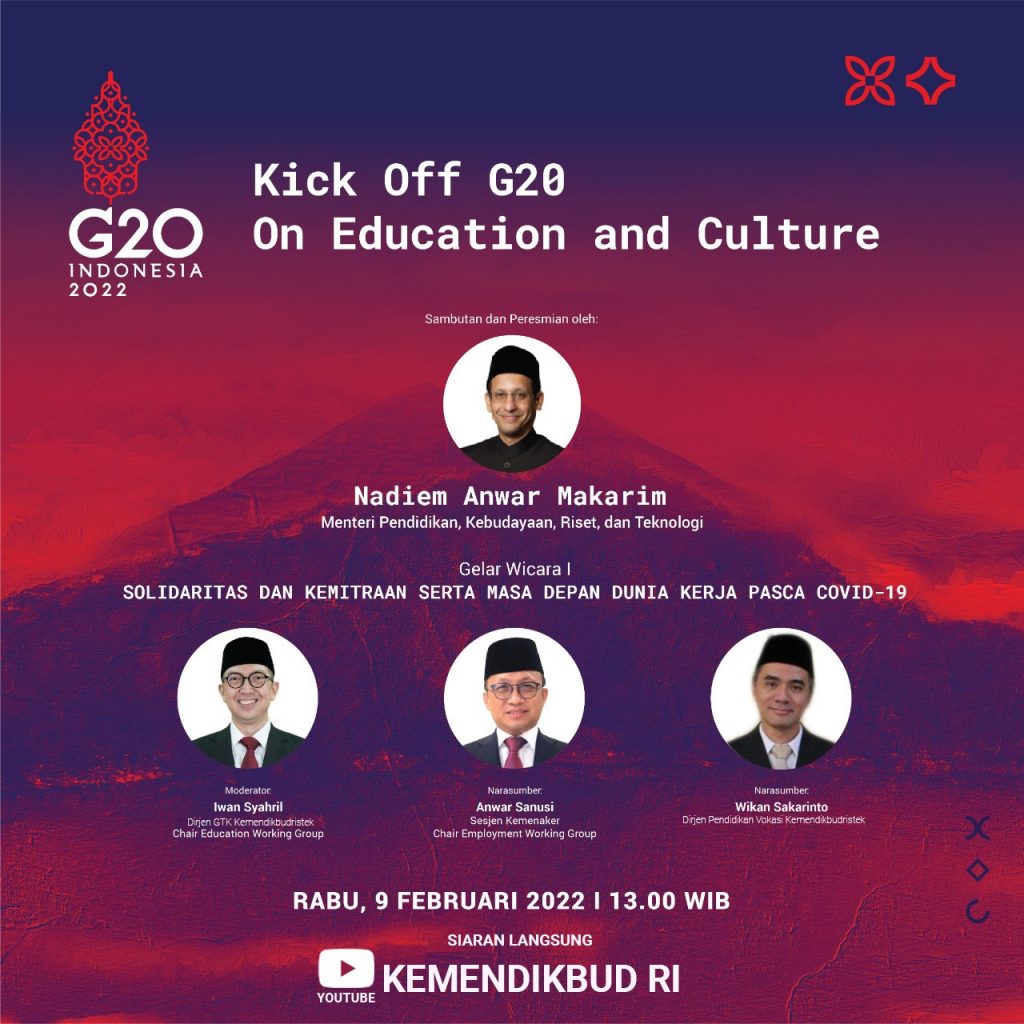 Karenanya, Menteri Nadiem mengajak masyarakat untuk menyaksikan “Kick Off G20 on Education and Culture” untuk mengetahui lebih lanjut apa saja agenda prioritas yang akan didorong kementerian yang dipimpinnya selama presidensi Indonesia pada G20.