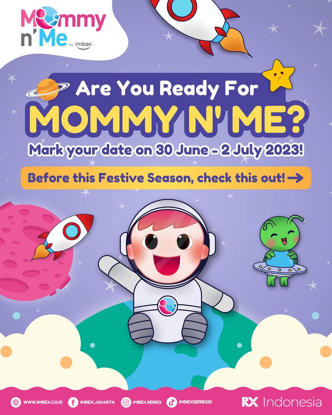Mommy N Me diselenggarakan oleh RX Indonesia dan didukung penuh oleh PT Bank Negara Indonesia (Persero) Tbk (BNI) sebagai Official Bank Partner. Menempati Hall A & Hall B, Jakarta Convention Center, Mommy N Me akan berlangsung selama 3 hari mulai tanggal 30 Juni — 2 Juli 2023, terbuka untuk umum pada pukul 09.00 —21.00 WIB. Dengan Harga Tiket Masuk Rp.30.000,00 (tiga puluh ribu rupiah) dan dapat dibeli secara online di Loket.com dan Gotix. Maria Achti, Project Director RX Indonesia menyampaikan “terima kasih atas kepercayaan dan kesetiaannya seluruh peserta pameran, yang telah memilih Mommy N Me sebagai salah satu. media pemasaran serta mendukung penyelenggaraaan Mommy N Me dari tahun ke tahun. Pada kesempatan ini, kami juga mengucapkan selamat datang kepada seluruh keluarga muda Indonesia yang berkunjung ke Mommy N Me, kami yakin, dengan dukungan peserta dan pengunjung pameran, Mommy N Me akan dapat terus berkembang dan menjadi destinasi belanja perlengkapan Ibu dan anak terdepan.”