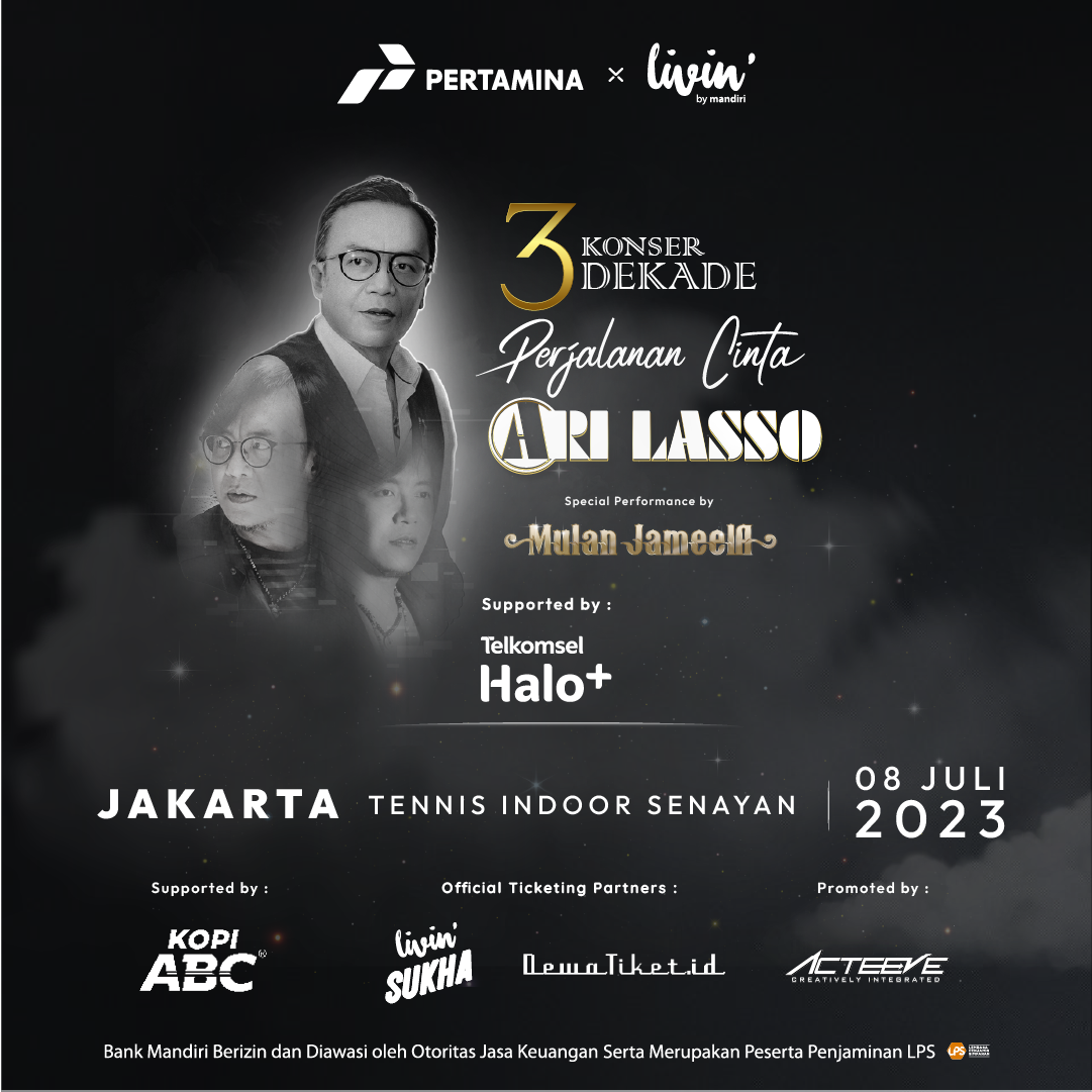 Pertamina x Livin’ by Mandiripresent3 Dekade Perjalanan Cinta Ari Lasso didukung oleh Telkomsel dan Kopi ABC, dipromotori oleh Acteeve Indonesia dan diselenggarakanoleh Redline Kreasindo.